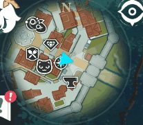 地图系统界面:角色箭头显示在当前场景对应的小地图位置上;角色面向以及视野方向定格在打开地图系统的瞬间。